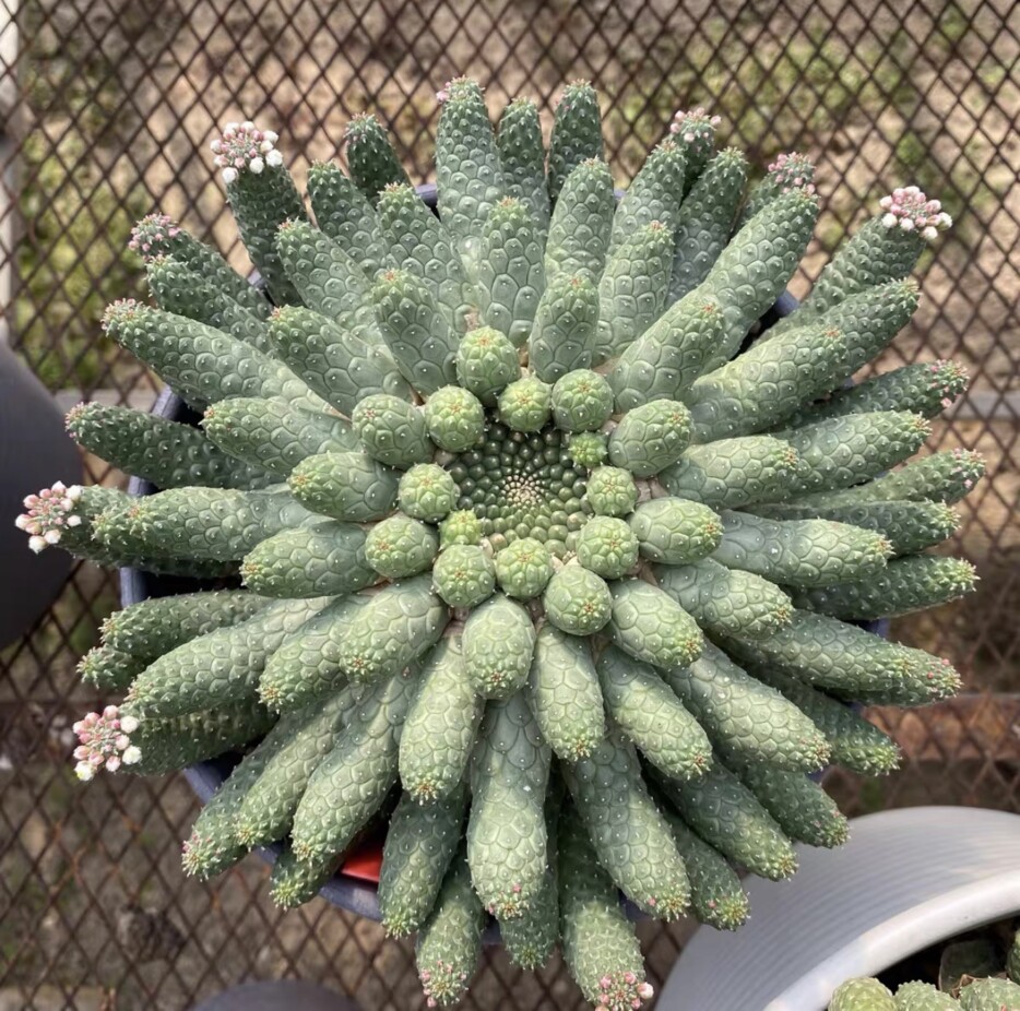 The surface of the caudex may be smooth, lightly textured, or sometimes mottled by environmental stresses (sun, temperature shifts). Color typically ranges from grayish green to olive, sometimes with tones of bronze or even purplish in response to sun exposure or cooler nights. New growth may appear brighter green, whereas older, more sun‑exposed surfaces often have deeper, more muted tones.