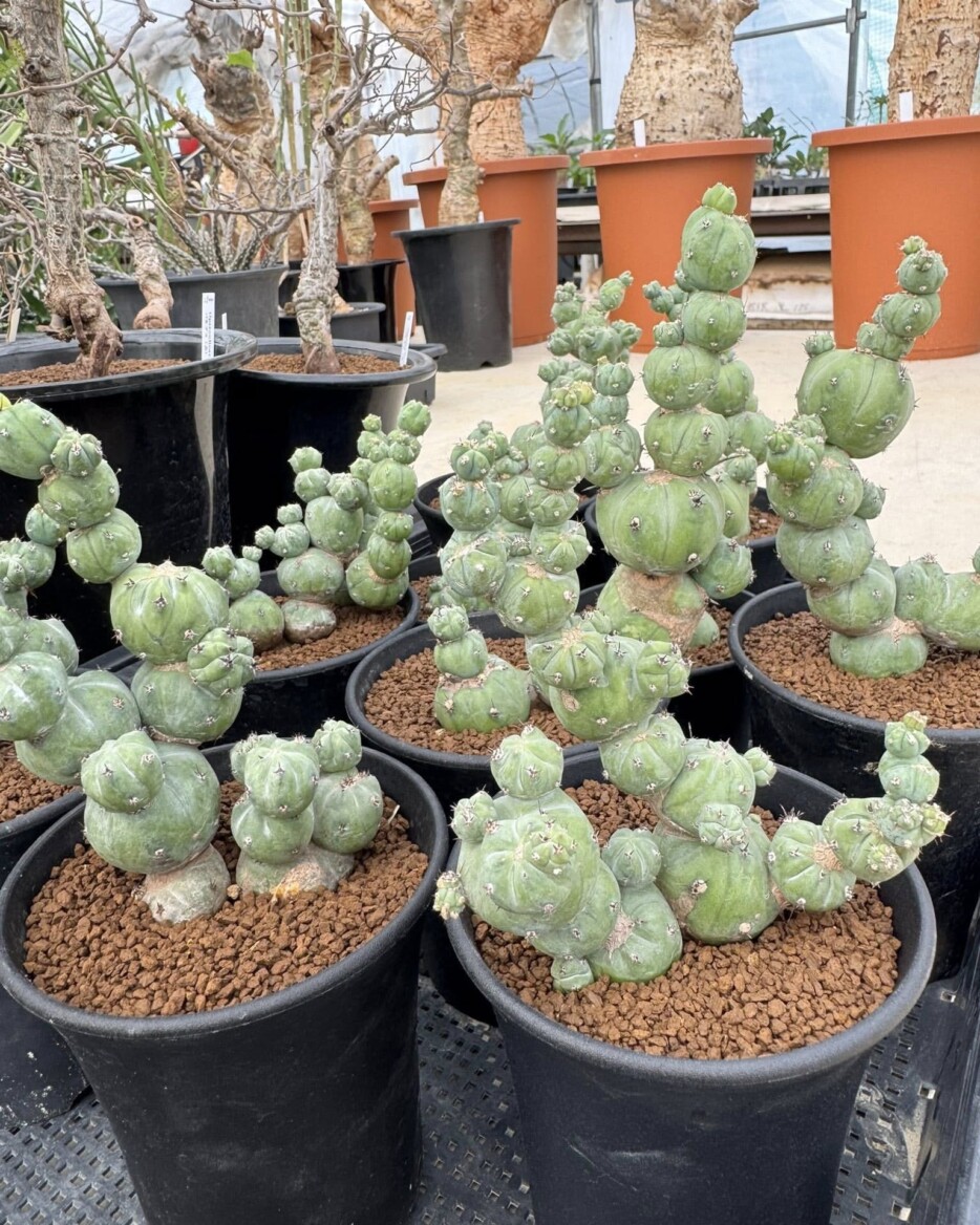 The coloration of Myrtillocactus geometrizans is one of its most appealing features. A powdery epicuticular coating, or bloom, gives the cactus a silvery blue sheen. In strong light, tones of blue, green, and even hints of lavender can emerge. The ribs may appear more pronounced, showcasing shades that shift subtly as the day progresses.Also ,we have caudexplants like operculicarya pachypus ,cyphostemma uter ,pachypodium gracilius