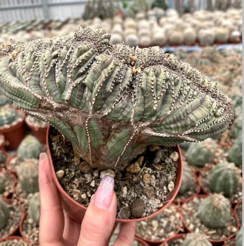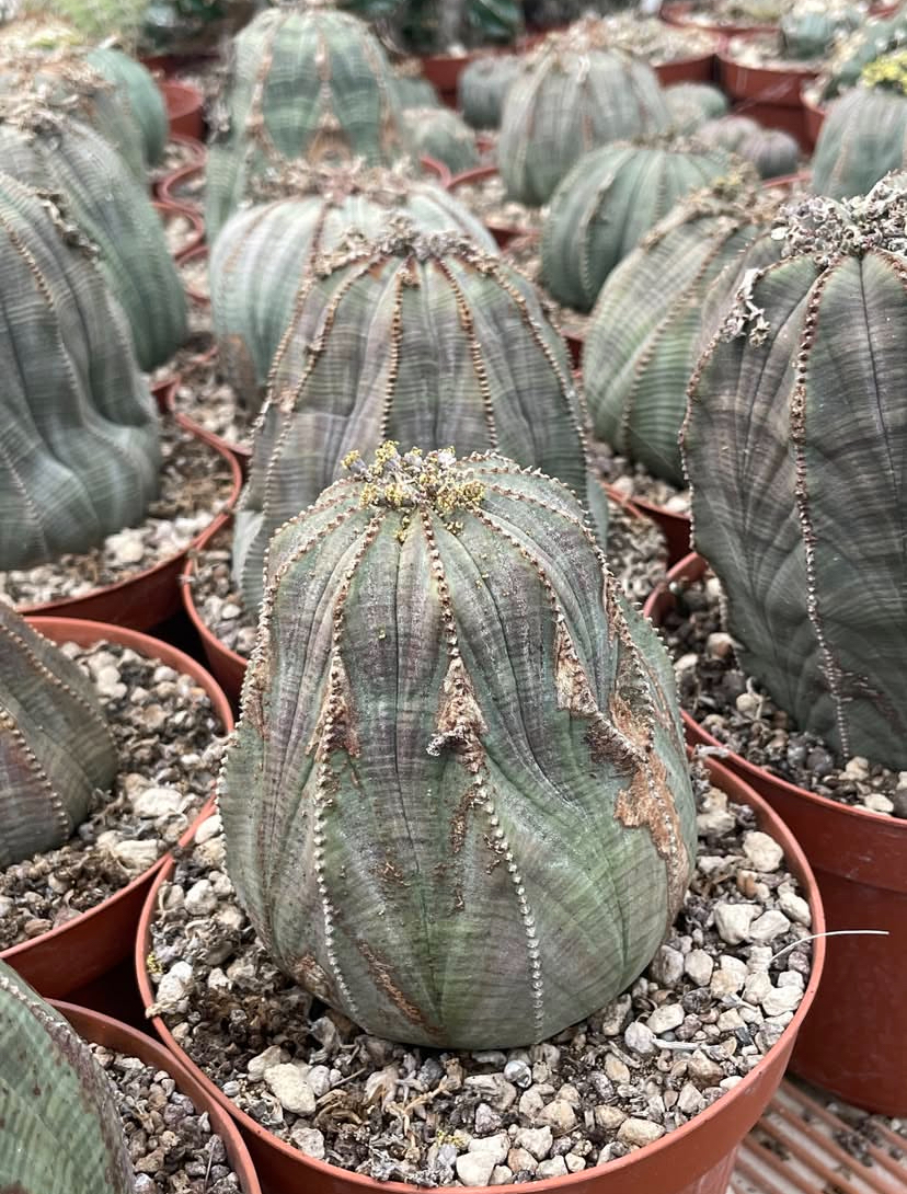 Young Euphorbia obesa plants form a near-perfect globe, typically between 6–15 cm in diameter (smaller when young; up to ~20 cm tall as they mature) If you’re looking for where to buy plants visit caudexplants.com . The stem is unbranched, with eight shallow ribs adorned by evenly spaced gibbous tubercles